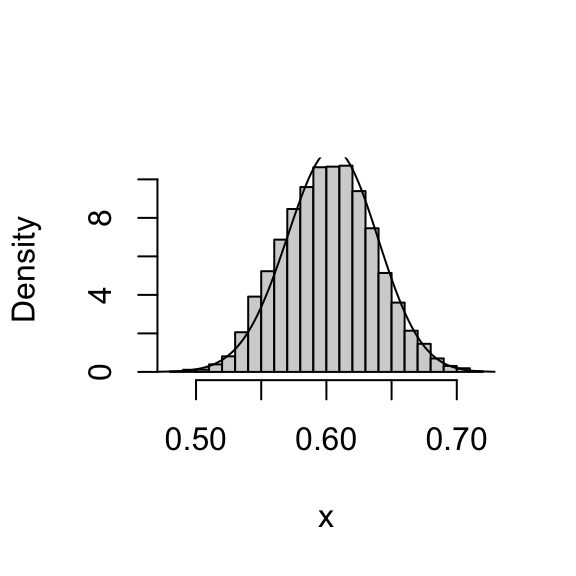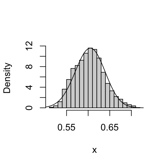 Now here’s some R code to compare the samples generated by the M-H algorithm with the theoretical posterior. In this case, the theoretical posterior is available analytically; since we observed \(A\) 121 times and \(a\) 79 times, the posterior for \(p\) is \(\mathrm{Beta}(121 + 1,79 + 1)\).