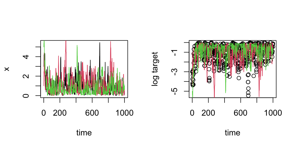 Any MCMC scheme aims to produce (dependent) samples from a “target” distribution. In this case we are going to use the exponential distribution with mean 1 as our target distribution. Here we define this function (on the log scale):