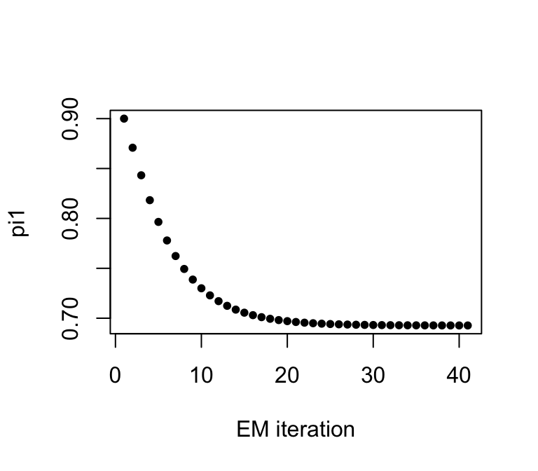 plot(pi1_iter,xlab = "EM iteration",ylab = "pi1",pch = 20)