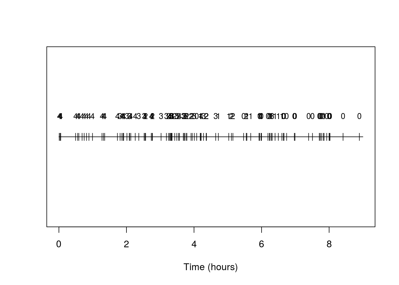 plot(c(0,t),c(0,0),type='l',xlab='Time (hours)',ylab='',yaxt='n');