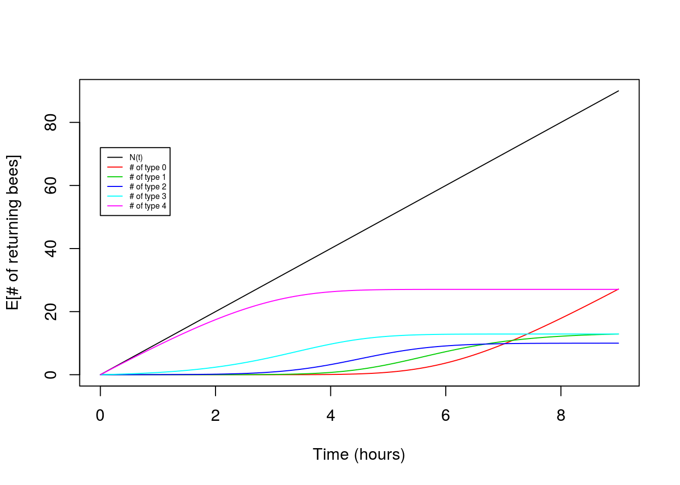 So if all goes well our Poisson Process result will help us derive the number of bees of each type at different time-points during the day. Going into this, we can expect that given \(b<0\) the beginning of the process will contain more type \(4\) individuals, and then later in the process it will decrease.
