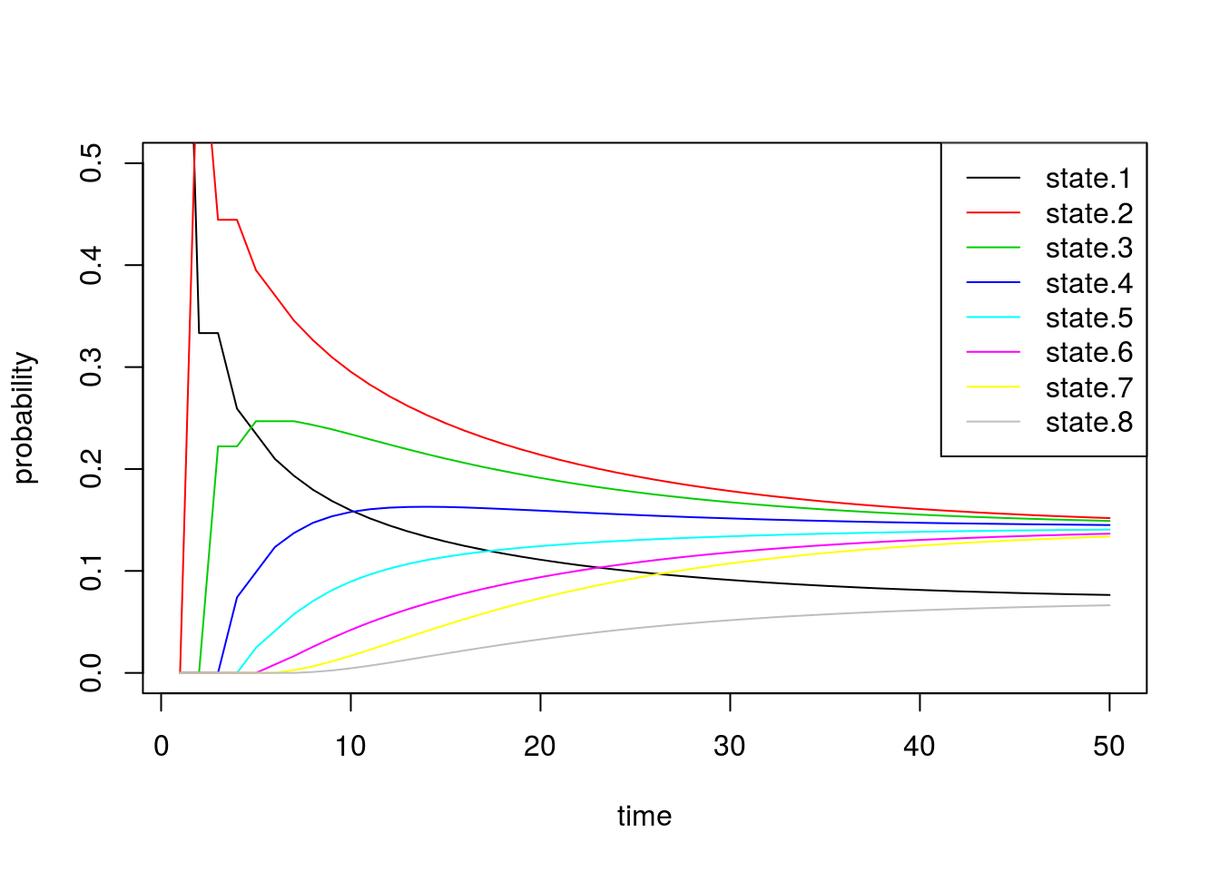 matplot(state.probs[1:50,], col=1:8, lty=1, type='l', ylab='empirical probability', xlab='time', ylim=c(0,1.2))