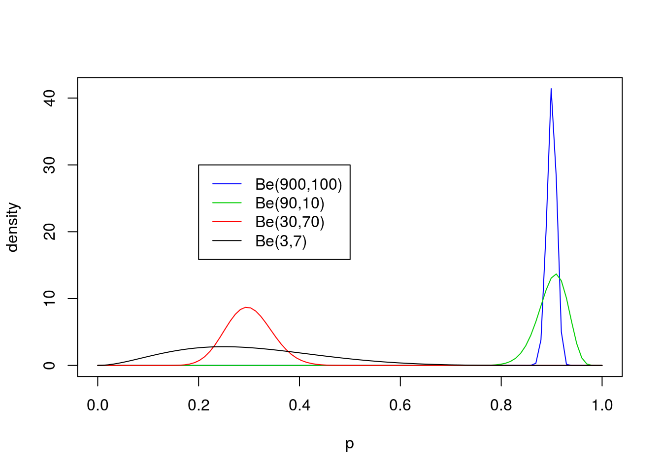 legend(0.2,30, c("Be(900,100)","Be(90,10)","Be(30,70)", "Be(3,7)"),lty=c(1,1,1,1),col=c(4,3,2,1))