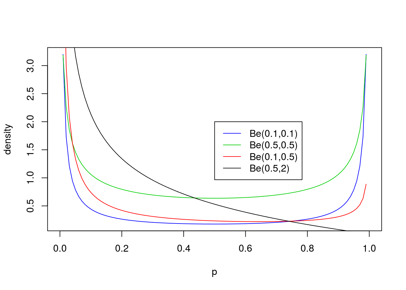 legend(0.5,2, c("Be(0.1,0.1)","Be(0.5,0.5)","Be(0.1,0.5)", "Be(0.5,2)"),lty=c(1,1,1,1),col=c(4,3,2,1))