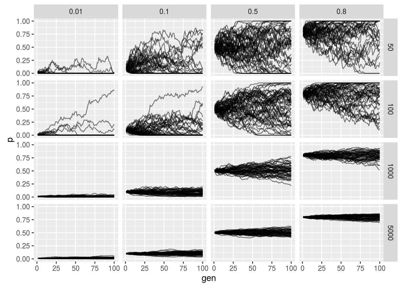 The horizontal facet is the starting frequency and the vertical facet is the effective population size. We see that as we increase the population size the less noisy the allele frequency trajectory as expected from our derivation. Additionally we see that probability of fixation or loss is more likely when lower and higher starting allele frequencies (again as expected).