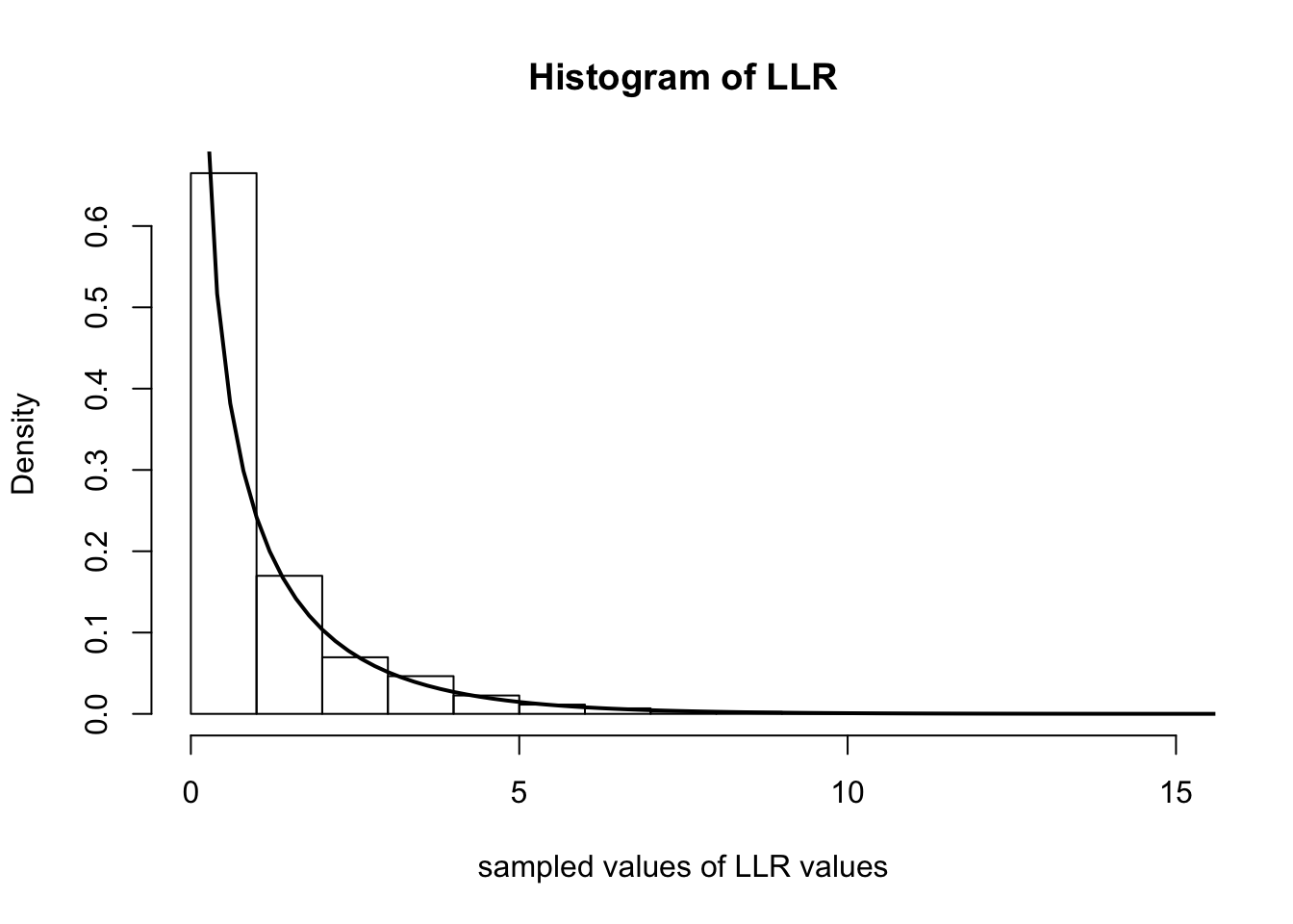 hist(samples, freq=F, main='Histogram of LLR', xlab='sampled values of LLR values')