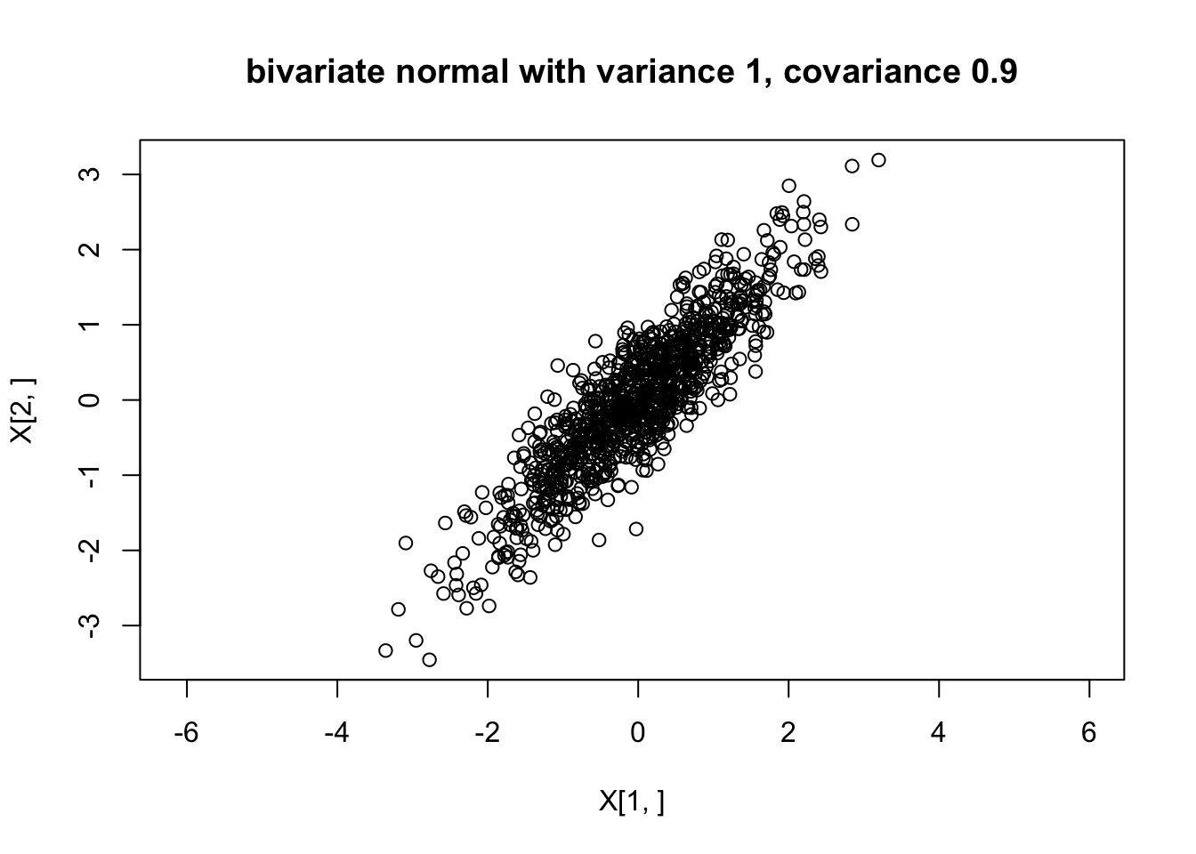 plot(X[1,],X[2,],main="bivariate normal with variance 1, covariance 0.9",asp=1)