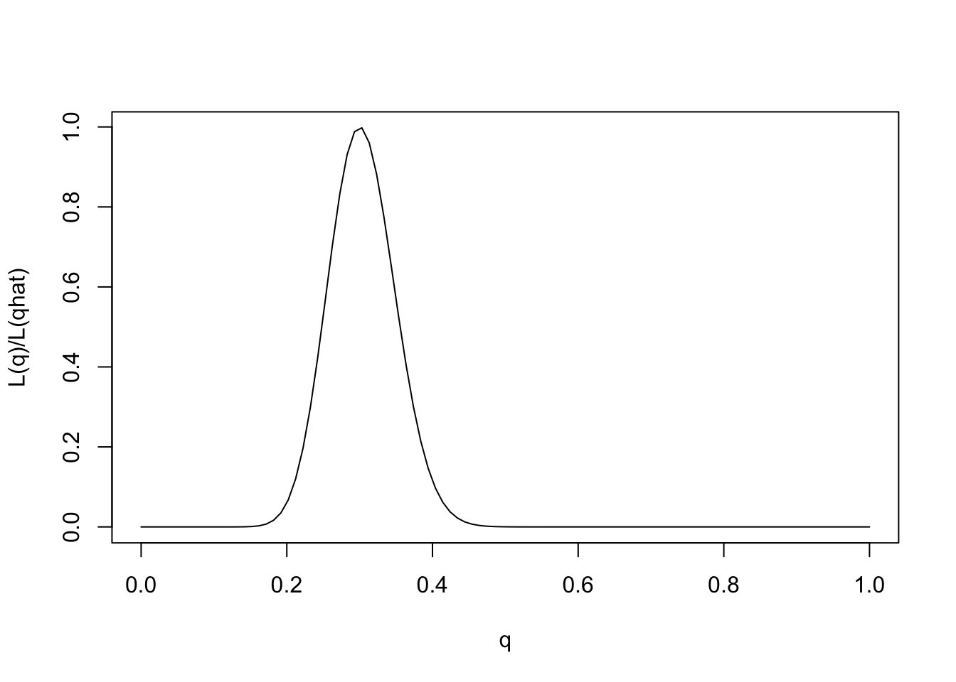 Note that for some values of \(q\) the likelihood ratio compared with \(q=0.3\) is very close to 0. These values of \(q\) are so much less consistent with the data that they are effectively excluded by the data. Just looking at the picture we might say that the values of \(q\) less than 0.15 or bigger than 0.5 are pretty much excluded by the data. We will see later how Bayesian analysis methods can be used to make this kind of argument more formal.
