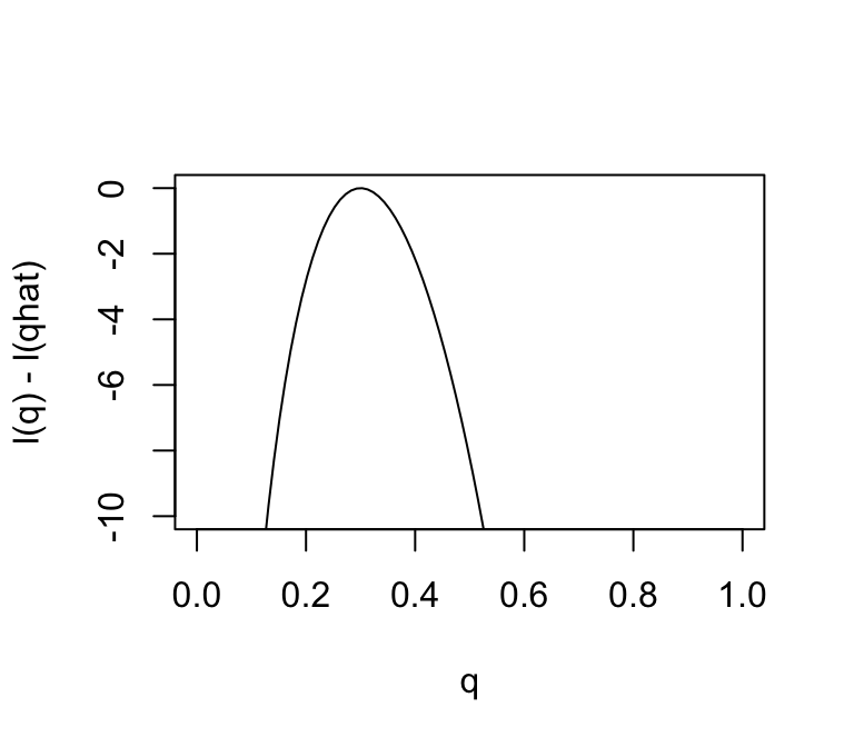 Changes in the log-likelihood function are referred to as “log-likelihood units”. For example, the difference in the support for \(q = 0.3\) and \(q = 0.35\) is \(l(0.3) - l(0.35)\) which is 0.5630377 log-likelihood units. Again, remember that it is differences in \(l\) that matter.