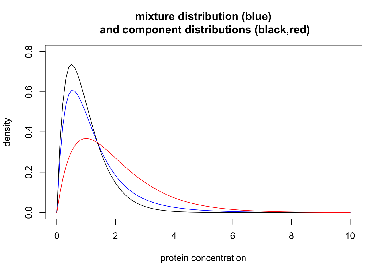 , col="blue", type="l", xlab="protein concentration", main="mixture distribution (blue)\n and component distributions (black,red)", ylab="density", ylim=c(0,0.8))