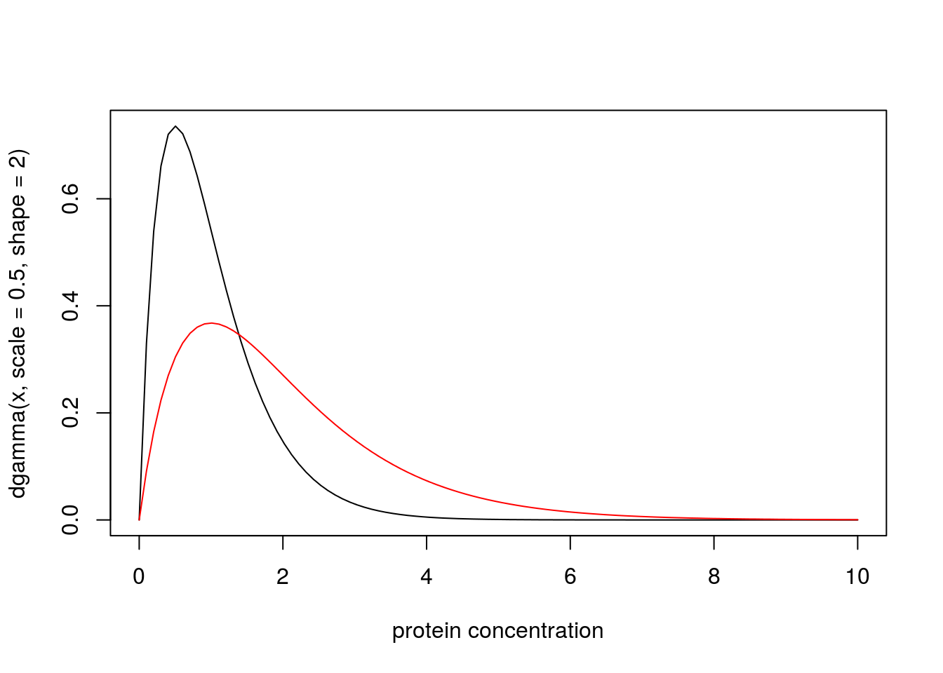 plot(x, dgamma(x,scale = 0.5,shape = 2), type="l", xlab="protein concentration")