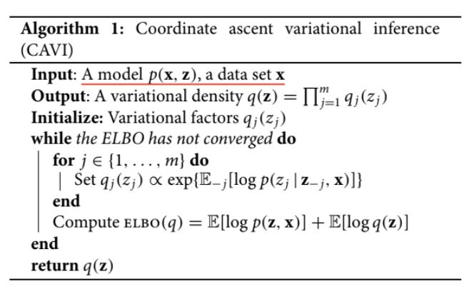 • CAVI iteratively optimizes each factor of the mean-field variational density, while holding others fixed.