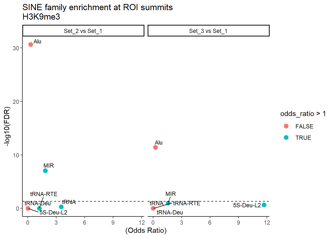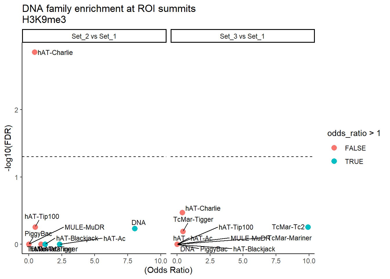 title = "DNA family enrichment at ROI summits\nH3K9me3"