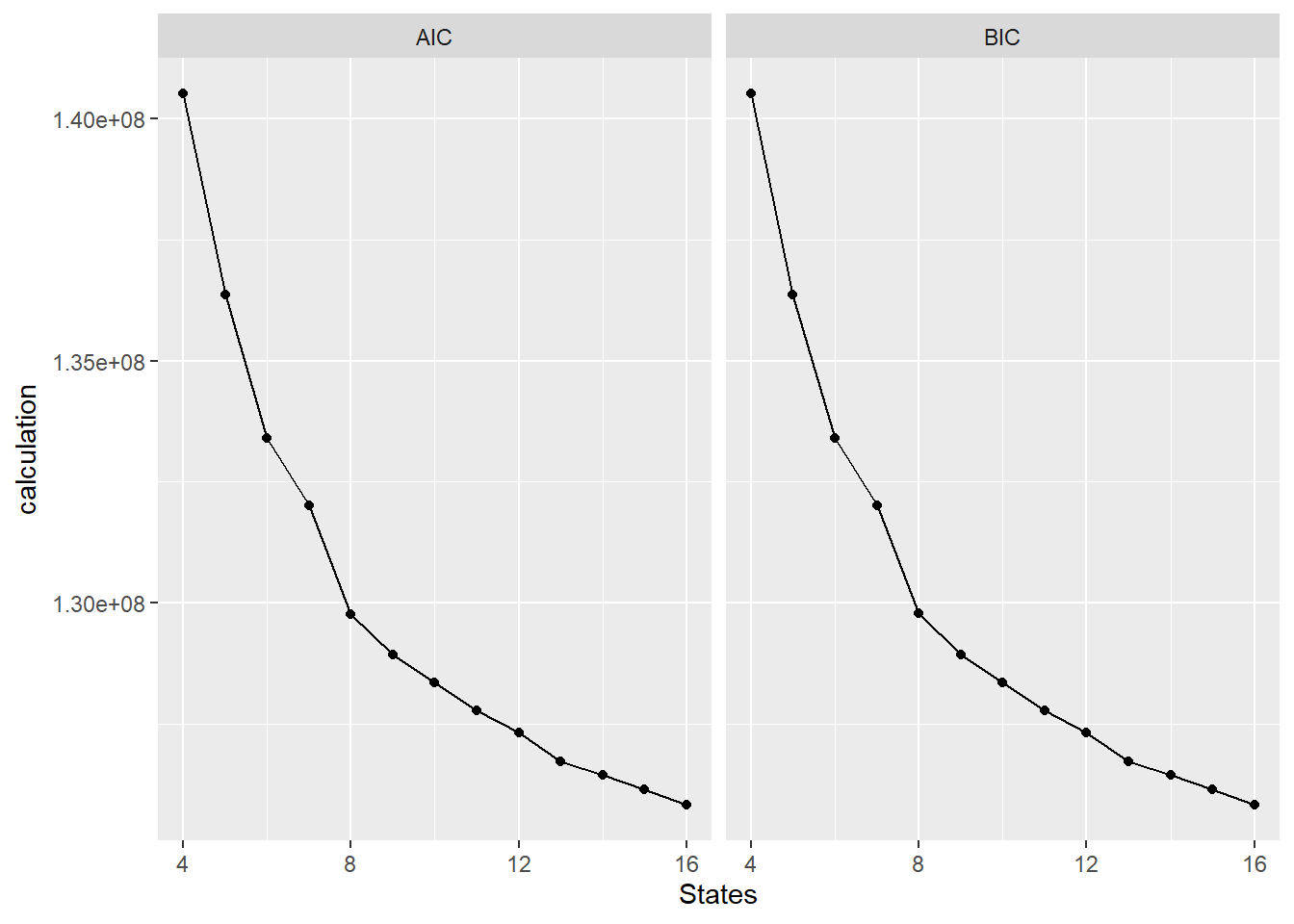 This is the AIC/BIC plots genrated to figure out how many states we wanted to use for our modeling of our data: