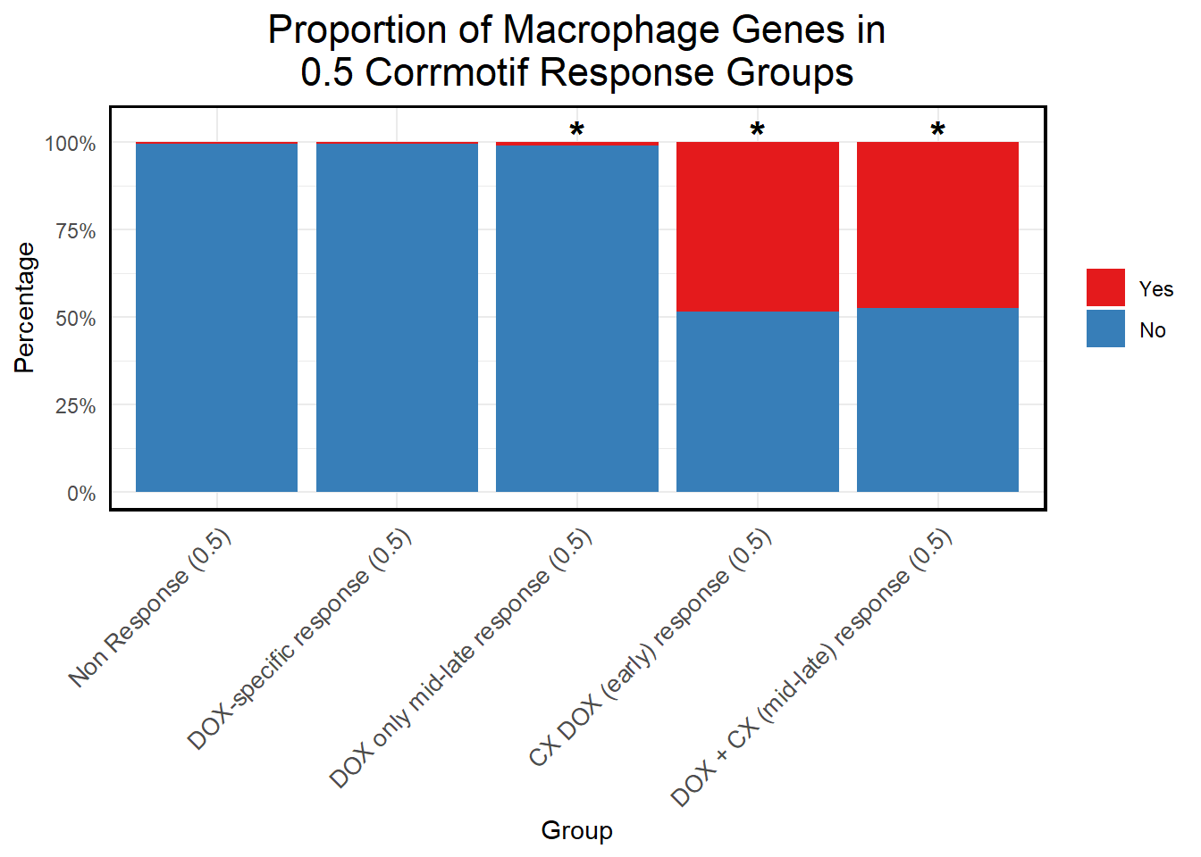 title = "Proportion of Macrophage Genes in\n0.5 Corrmotif Response Groups",