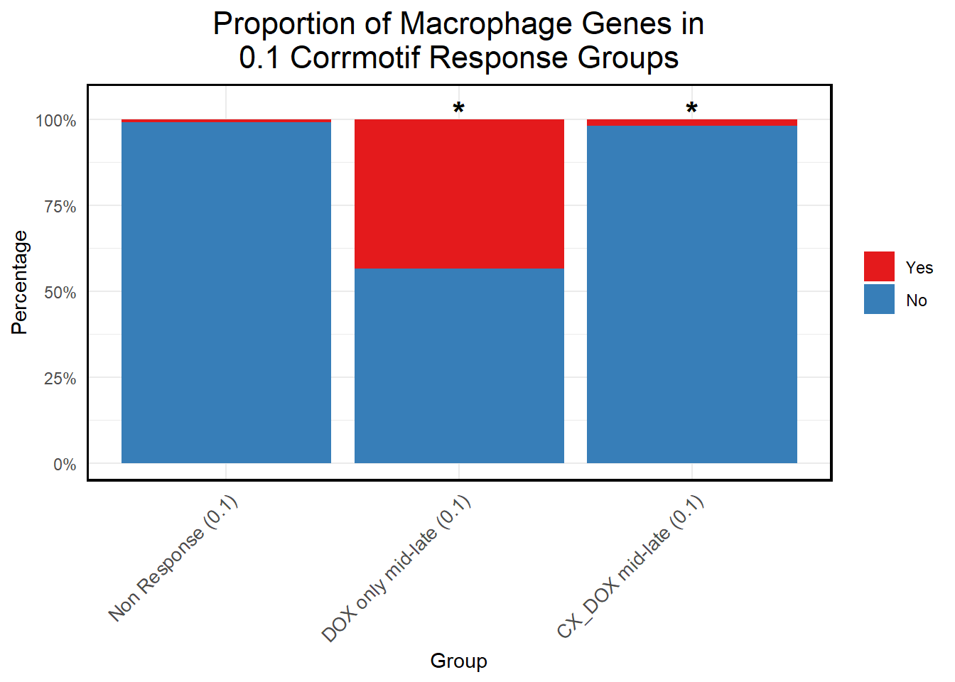 title = "Proportion of Macrophage Genes in\n0.1 Corrmotif Response Groups",