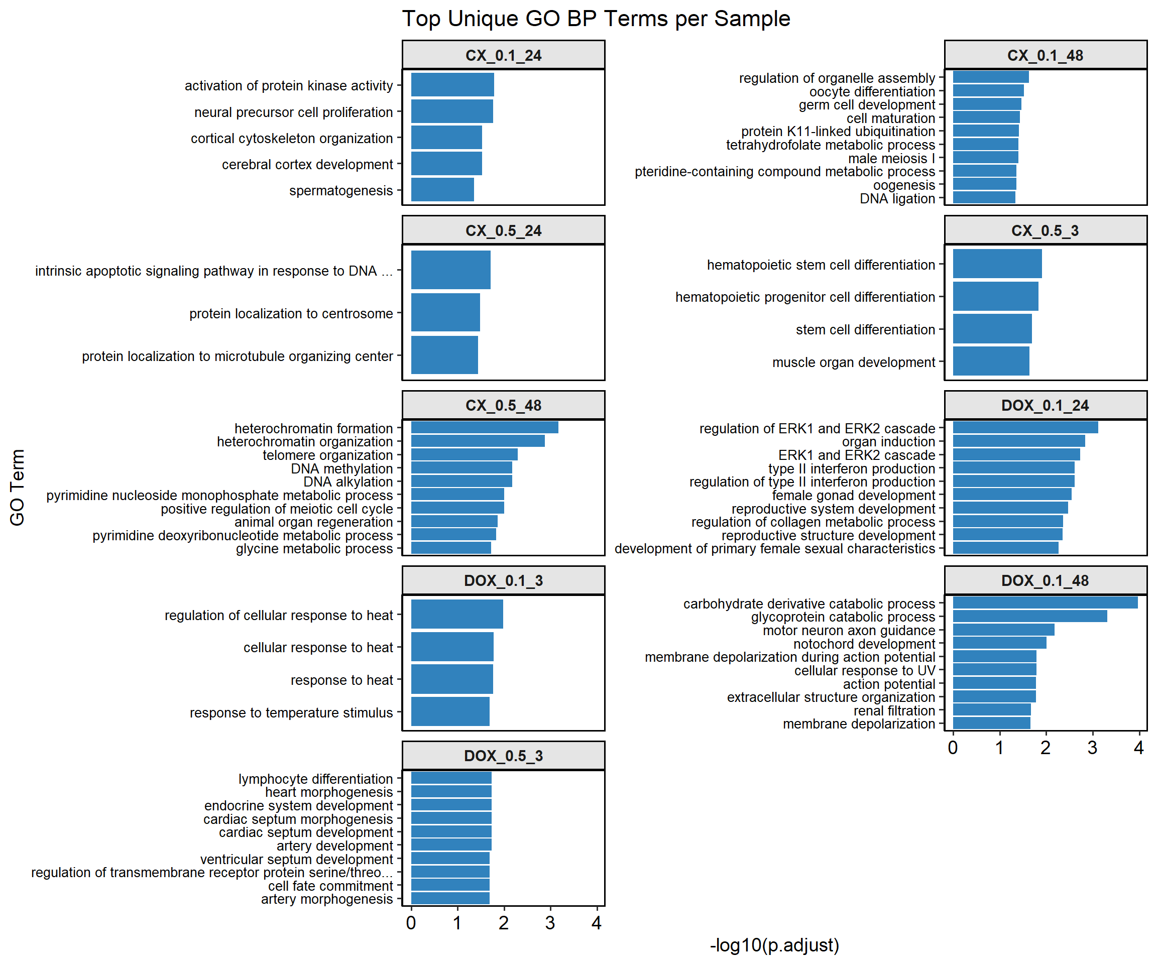 labs(x = "-log10(p.adjust)", y = "GO Term", title = "Top Unique GO BP Terms per Sample") +
