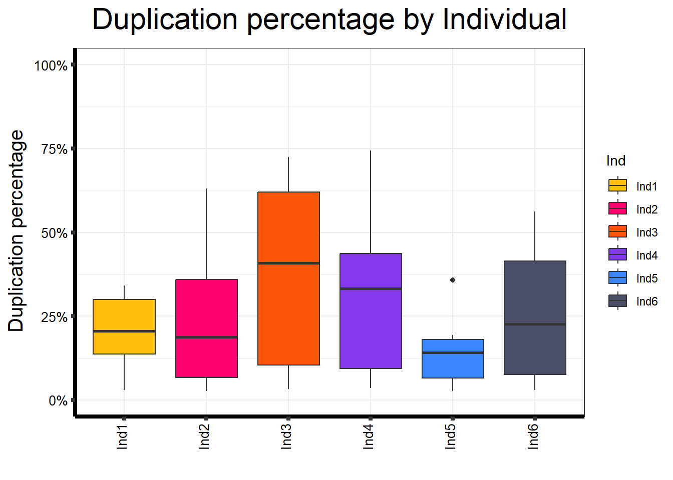 ggplot(aes(x = Ind, y = Duplication.percentage, fill = Ind)) +