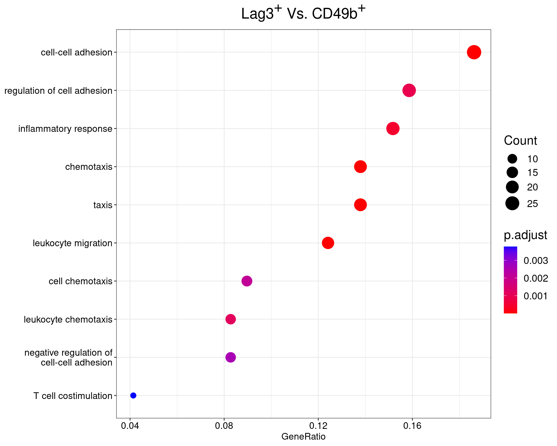 All 19 ontologies considered enriched in the set of 99 up-regulated genes mapped to EntrezIDs from the comparison LAG3vCD49b. Enrichment testing was performed using Fisher's Exact Test compared to the set of 10,006 unique EntrezIDs mapped to genes considered as detectable. The percentage of nonDE genes mapped to the ontology are also given. P-values are Bonferroni adjusted and all pathways are considered enriched using an adjusted p-value < 0.05. In order to see all DE genes, hover your mouse over the final column. Where the identical genes map to multiple terms within each ontology, only the term with the lowest p-value (i.e. strongest enrichment) is shown. As a result, some of the pathways seen in the above dotplots may not be presented in these tables.