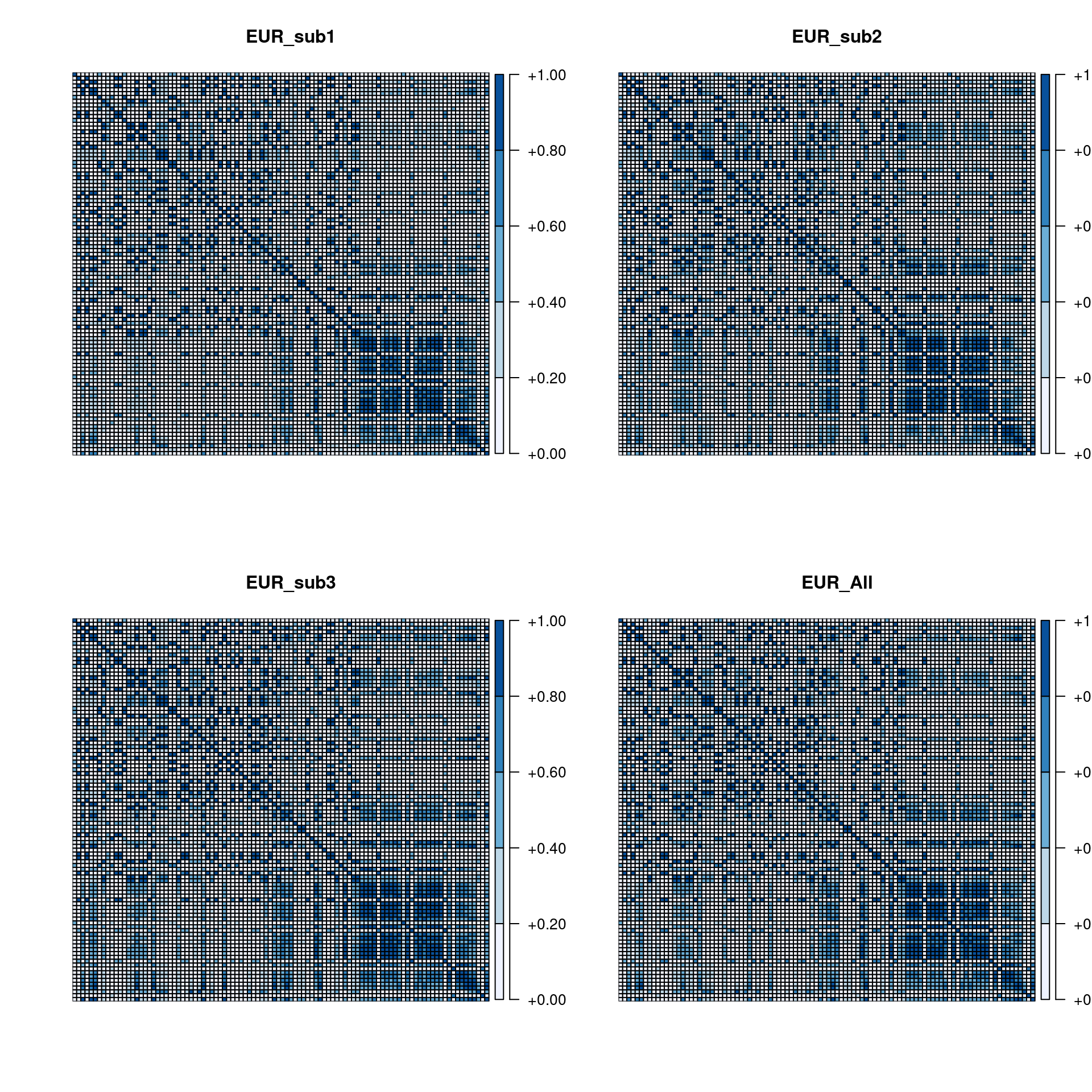 plot(as.matrix(ld1), axis.col=NULL, axis.row=NULL, xlab='', ylab='', main='EUR_sub1', col=brewer.pal(5,name = "Blues"),spacing.key=c(2,2,1))