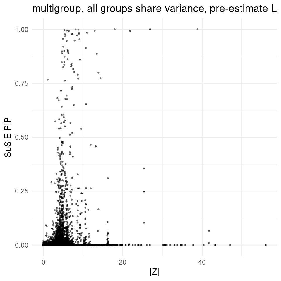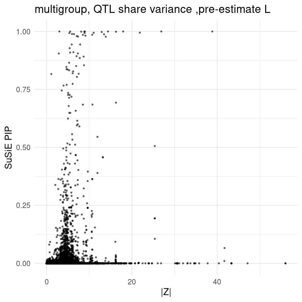 labs(x ="|Z|" , y = "SuSiE PIP", title = "multigroup, QTL share variance ,pre-estimate L") +