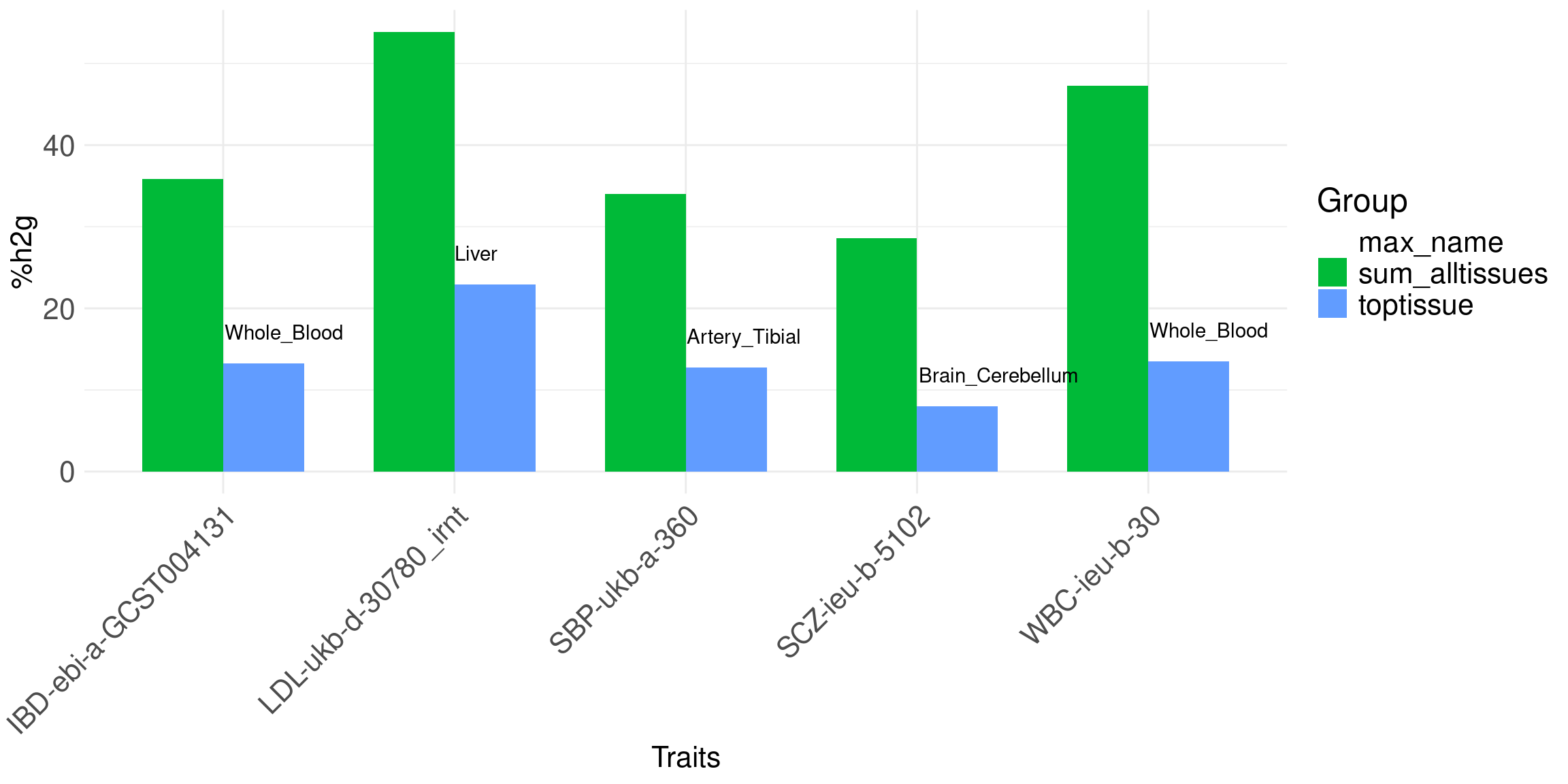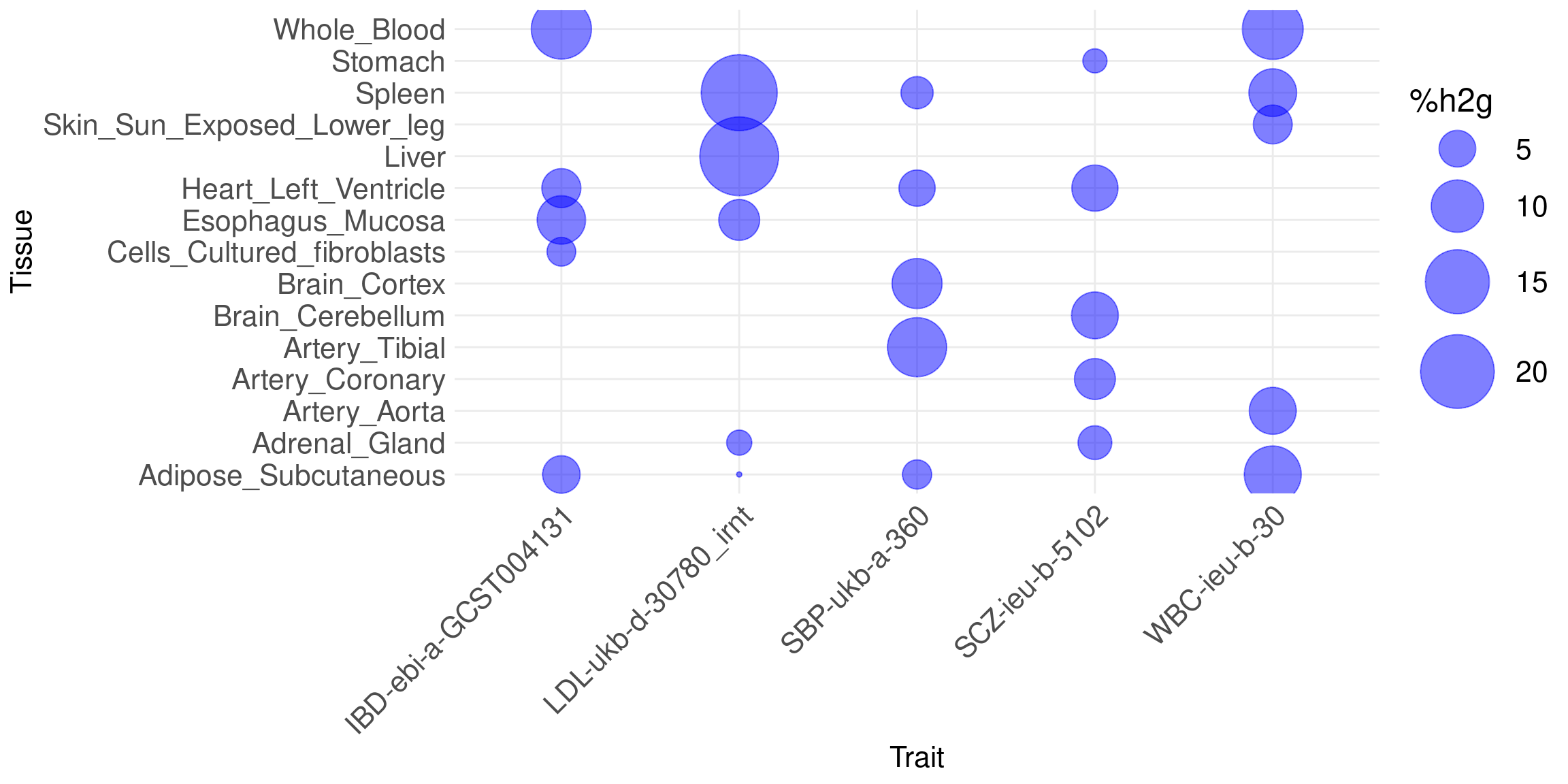 Bubble plot: show %h2g explained by molecular QTLs of each tissue on each trait. Use union of five tissues across all traits.