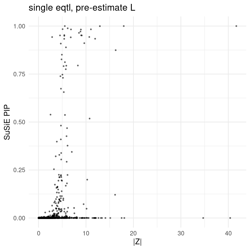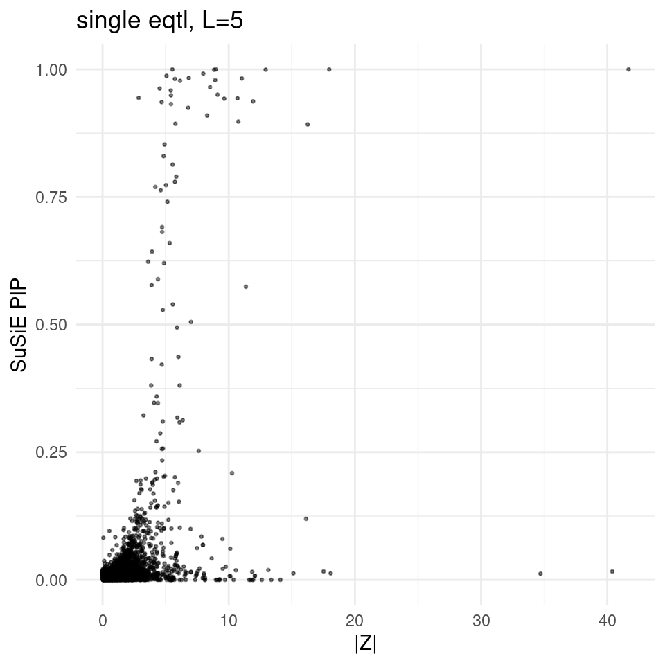 labs(x ="|Z|" , y = "SuSiE PIP", title = "single eqtl, L=5") +