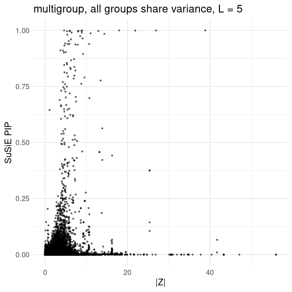 labs(x ="|Z|" , y = "SuSiE PIP", title = "multigroup, QTL share variance ,pre-estimate L") +