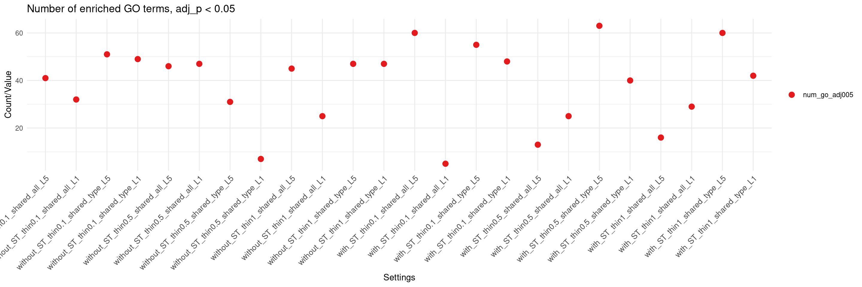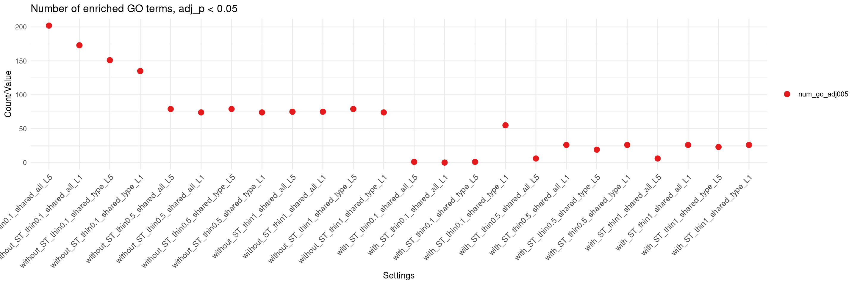 columns_to_plot = c("num_go_adj005"), title = "Number of enriched GO terms, adj_p < 0.05")
