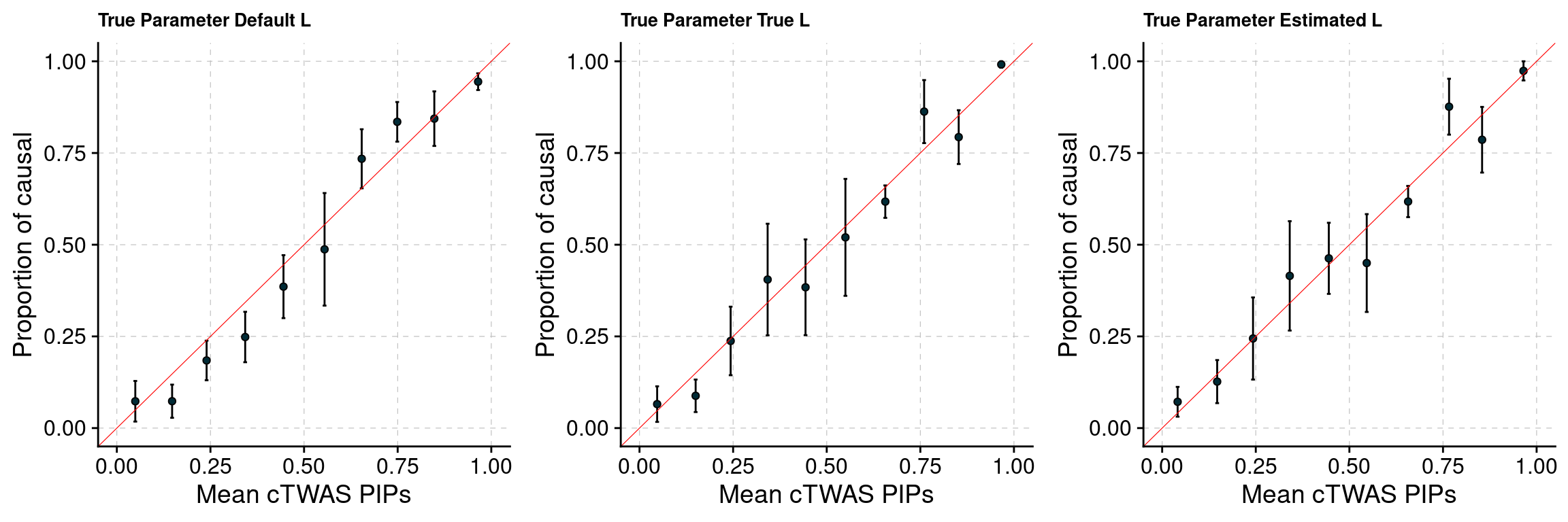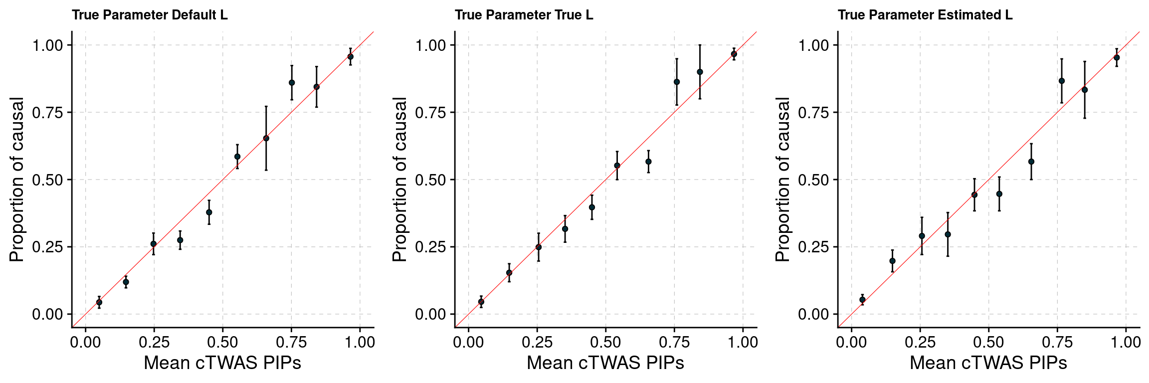 This four expression traits simulation study is conducted to evaluate our new cTWAS software performance (parameter estimation, PIP calibration …). Four expression traits from PredictDB are used in this study, which are Liver, Adipose, Lung and stomach. Liver and Adipose are selected as causal tissues, each with 3% PVE and 0.9% prior. Lung and stomach are non-causal tissues with 0% PVE. Two types of LD between weight SNPs (calculating gene z score) are used and compared in this study. And their performance are very close because most genes only have one weight SNP.