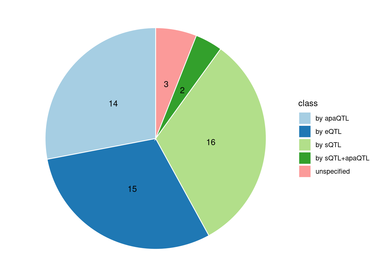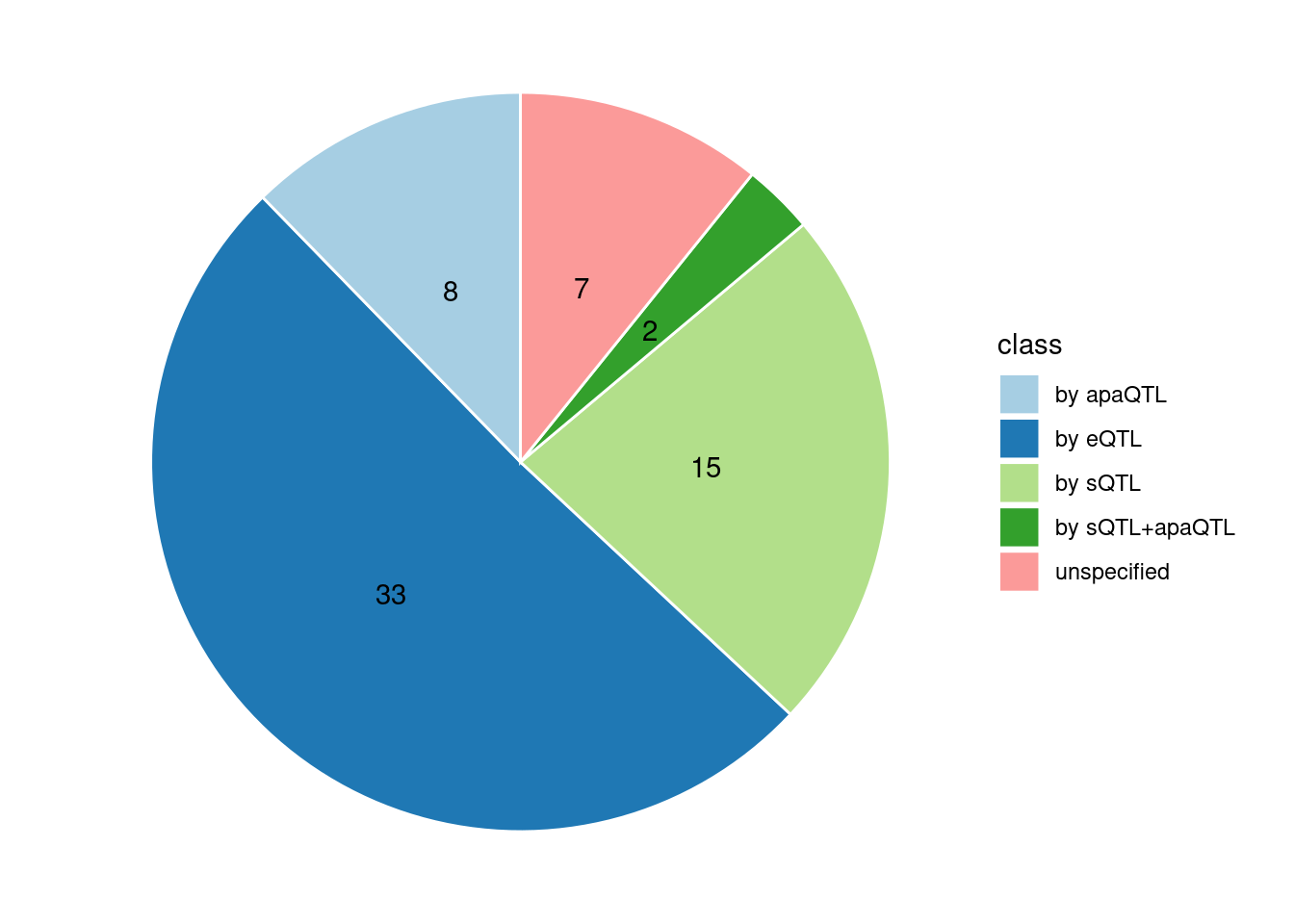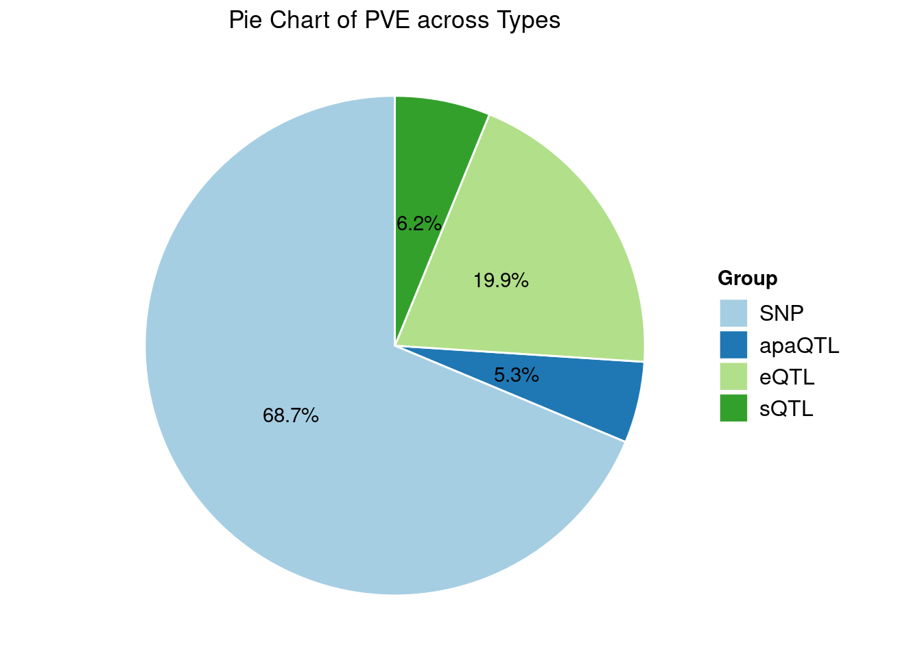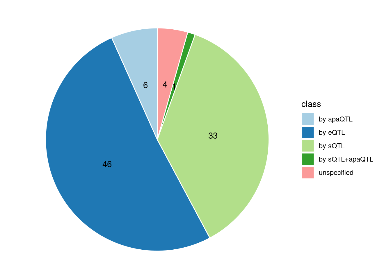 4. Specific molecular traits of top genes: we creates a pie chart to visualize the proportion of genes classified into different categories based on their PIPs contributed by each genetics contexts. The categories are based on the proportion of each QTL type relative to the combined PIP value:
