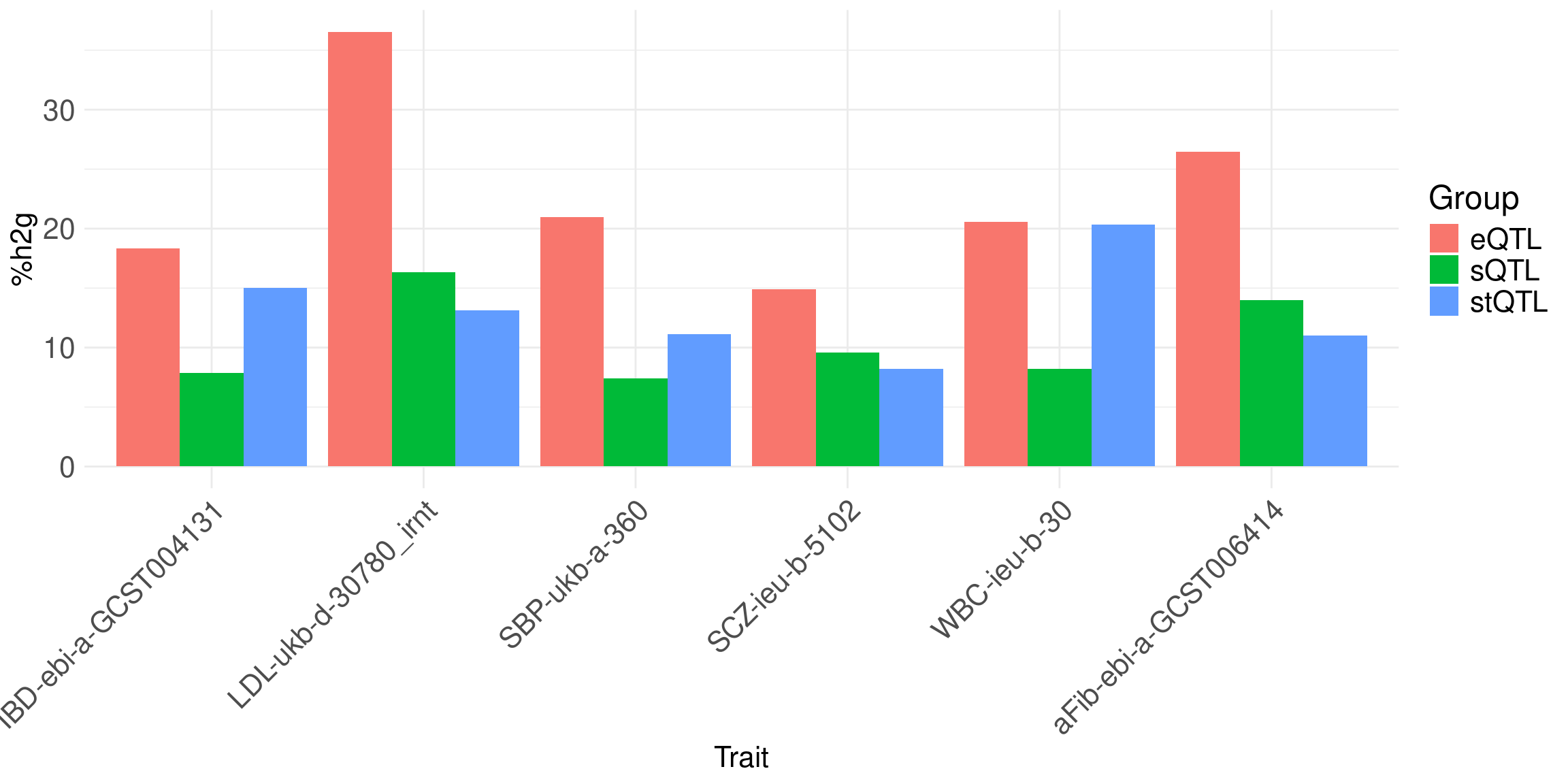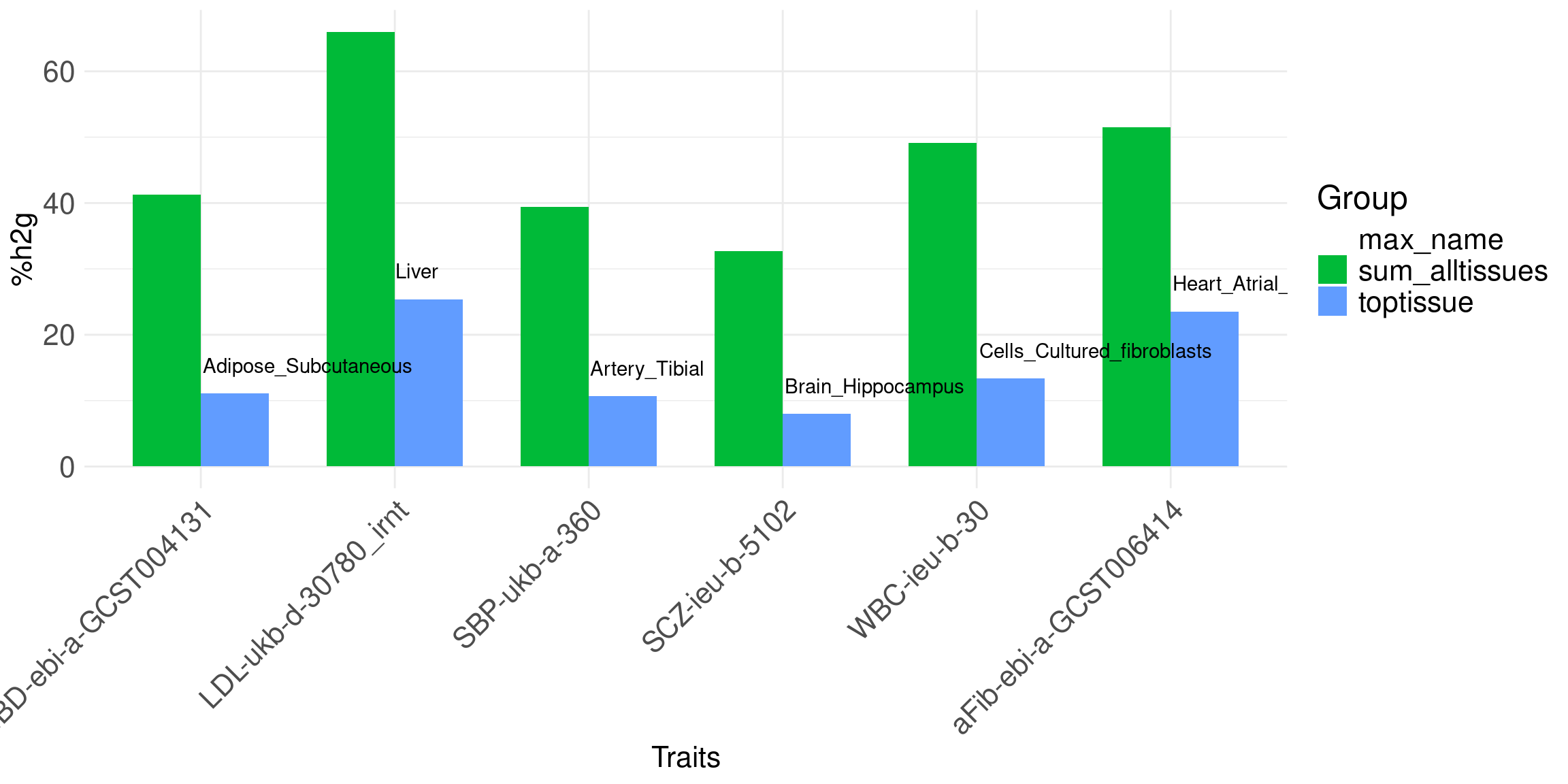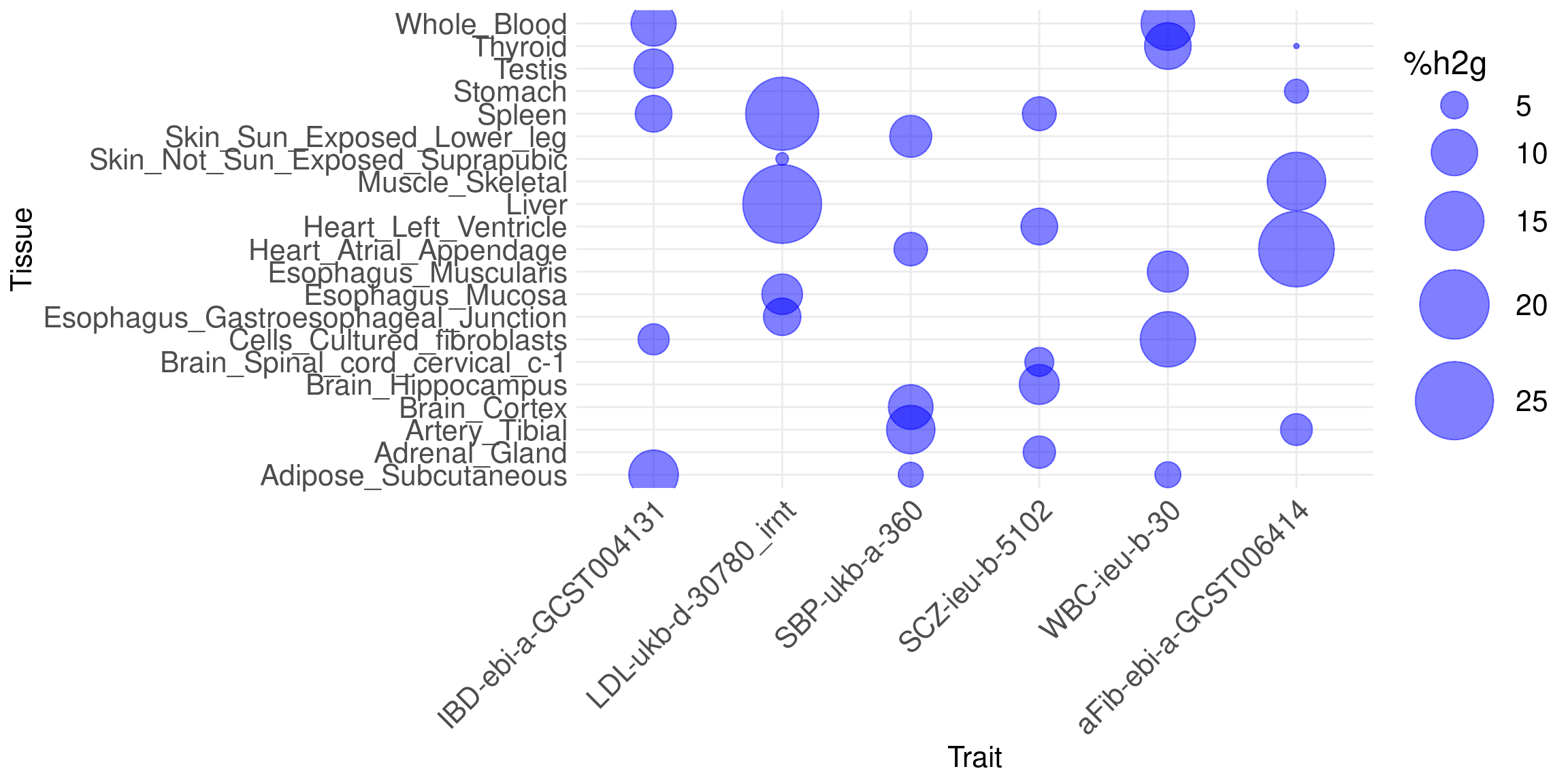 Bubble plot: show %h2g explained by molecular QTLs of each tissue on each trait. Use union of five tissues across all traits.