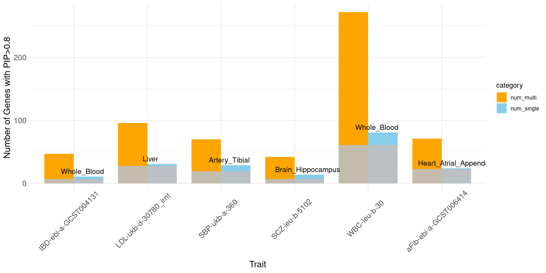 labs(x = "Trait", y = "Number of Genes with PIP>0.8") +