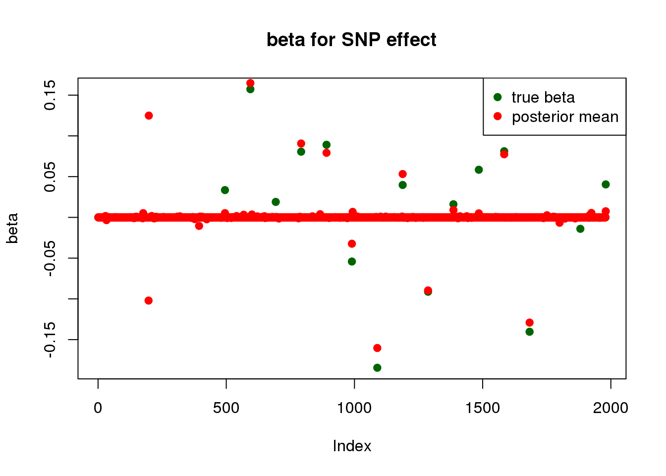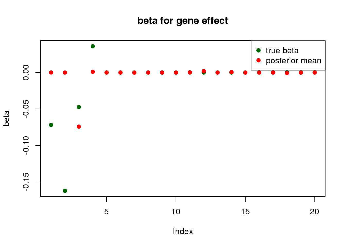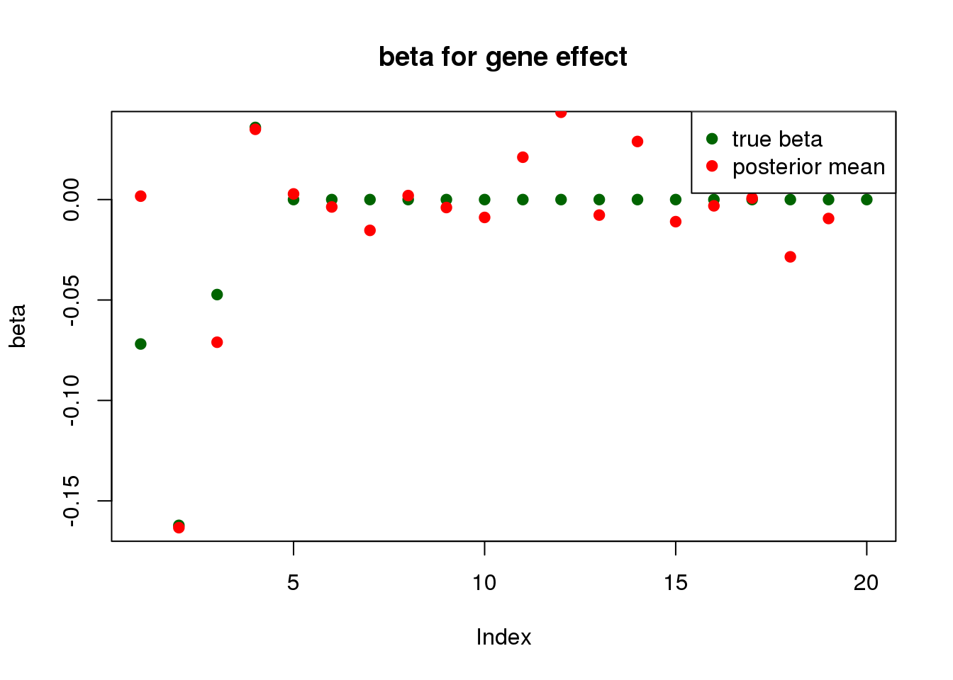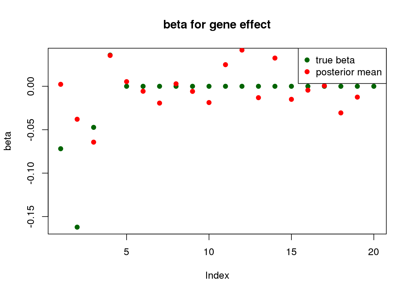 plot_beta(beta[gene.idx], fit$fit2$beta, main = "beta for gene effect")