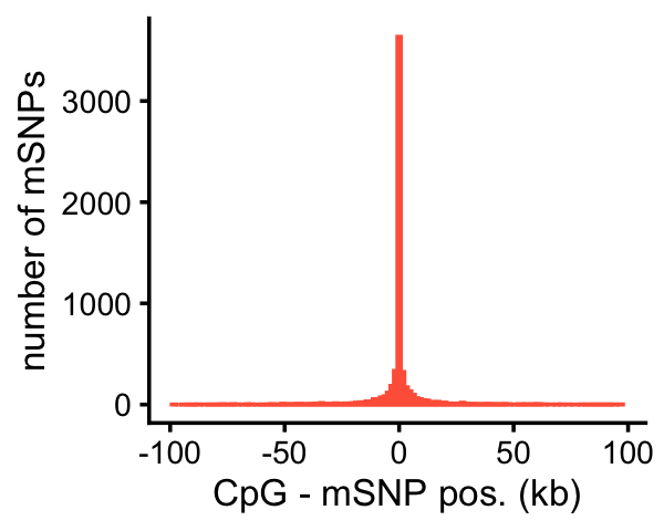 Finally, this plot shows the distribution of the distances between the mSNP and the nearest CpG affected by that SNP: