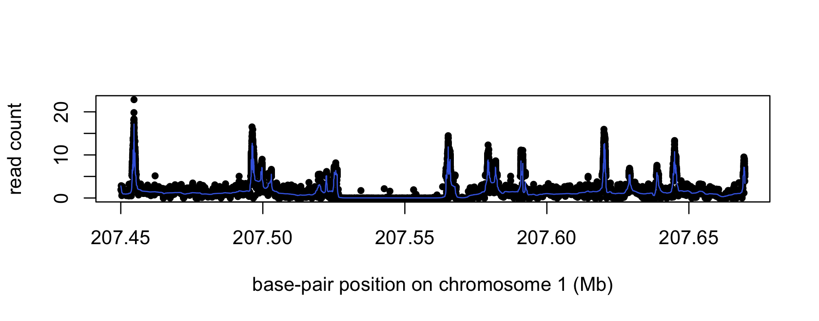 This plot shows the read count data from the ChIP-seq assay (black dots) and the “smoothed” signal obtained by running SMASH on these data (blue curve):