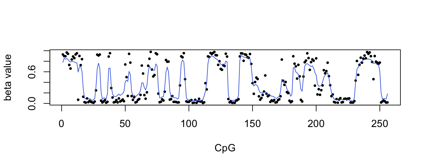 Note that the CpG locations are ordered sequencing by base-pair position along the chromosome (specifically, chromosome 20, near gene CASS4). However, the positions of the CpG probes are not distributed uniformly; there are some large gaps where there is no probe. The methylation data are shown in this way to make the spatial structure more obvious.