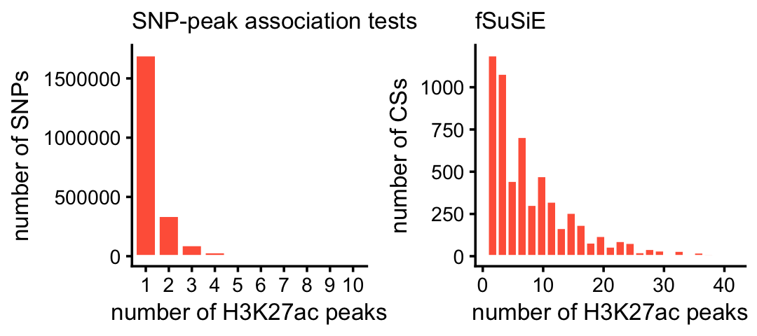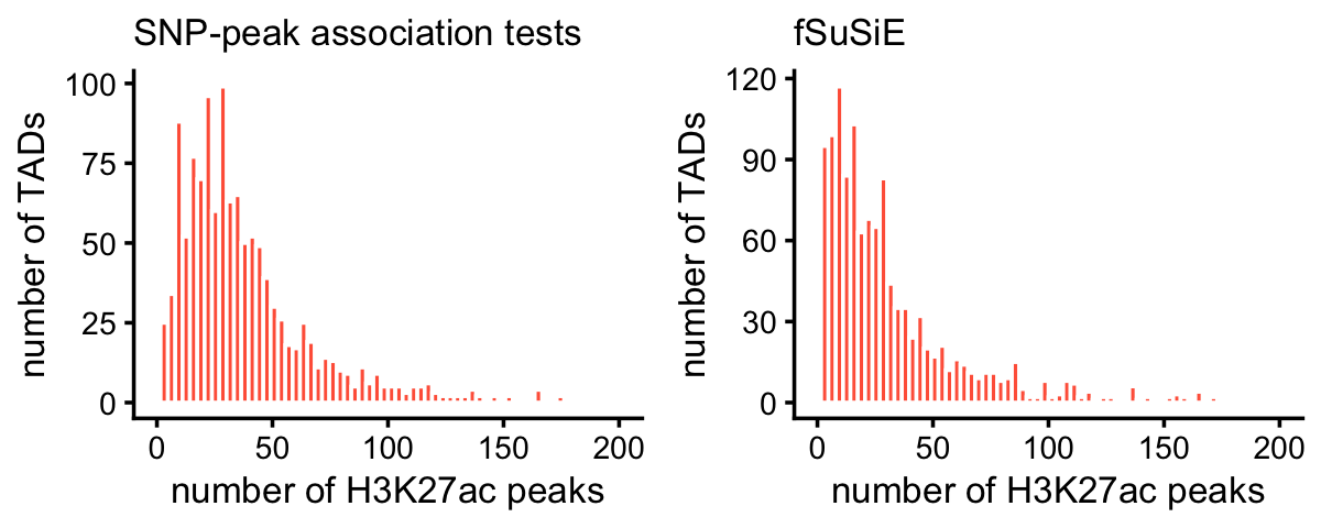 labs(x = "number of H3K27ac peaks",y = "number of TADs",title = "fSuSiE") +