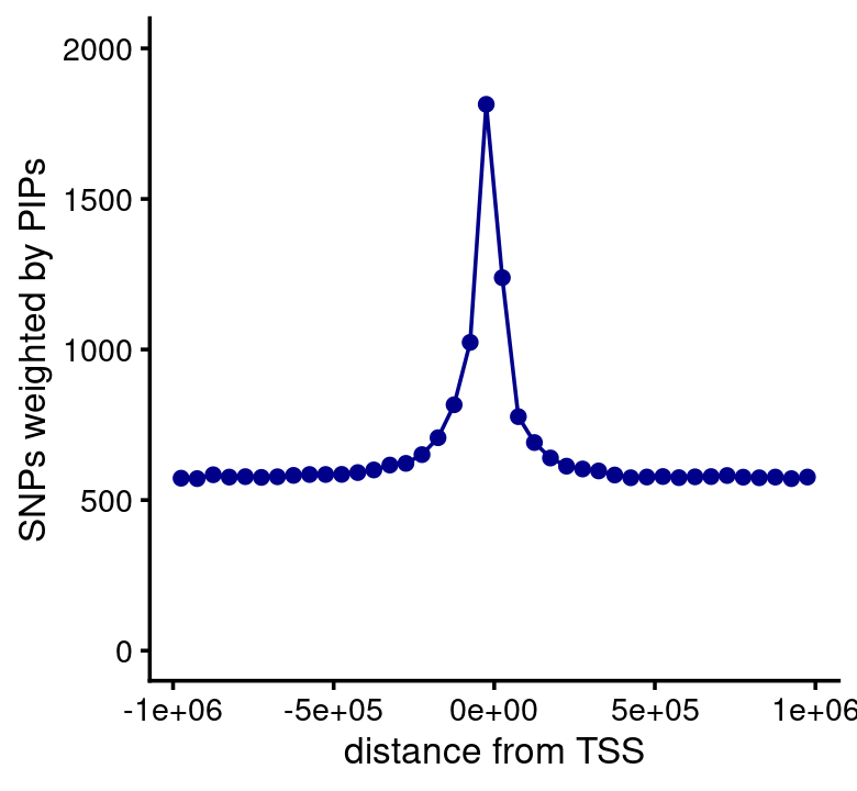 labs(x = "distance from TSS",y = "SNPs weighted by PIPs") +