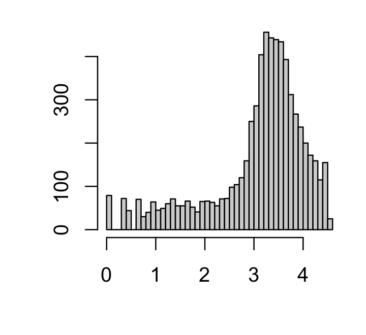 hist(log10(x),n = 64,xlab = "",ylab = "",main = "")