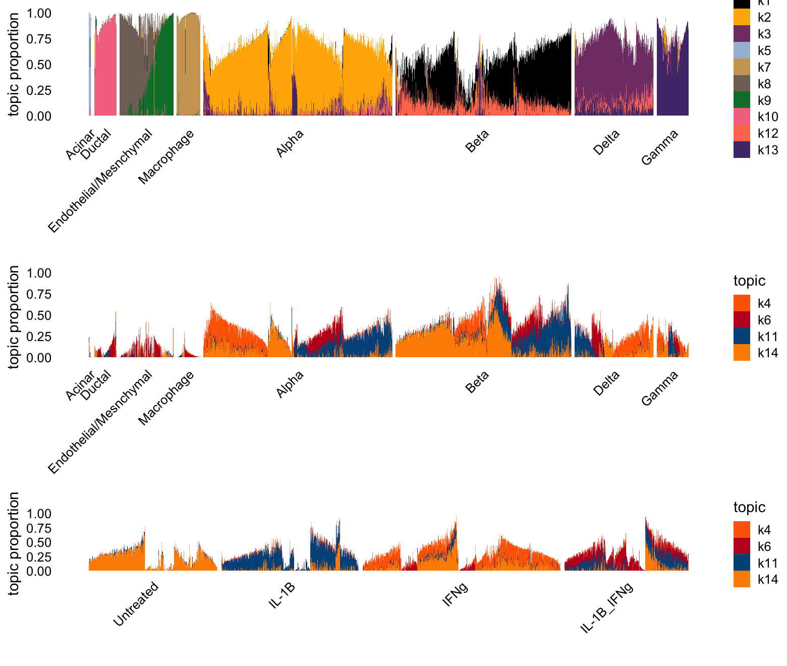 Rmd 546d291 Peter Carbonetto 2025-06-23 Improved the structure plots for the topic model with k=12 in the pancreas_cytokine_mf_comparison analysis.