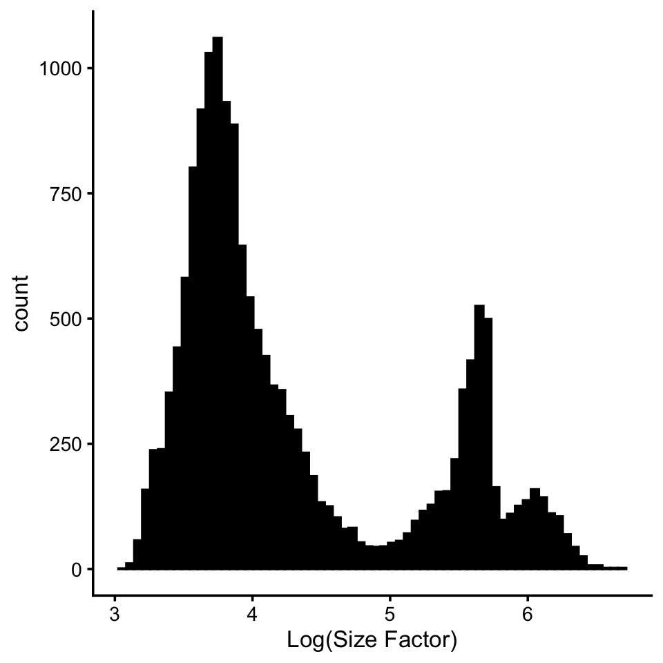Visualize the distribution of total counts (size factors) per cell in log scale.