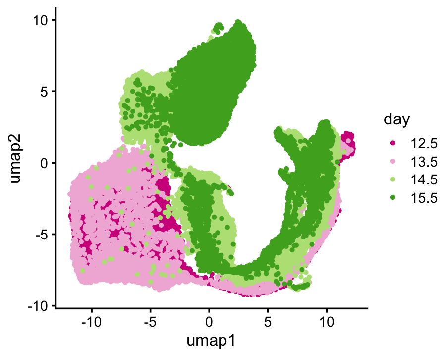 Beyond the main cell types and proliferating/non-profilerating, there appears to be additional structure in the data corresponding to the different lineages (days):