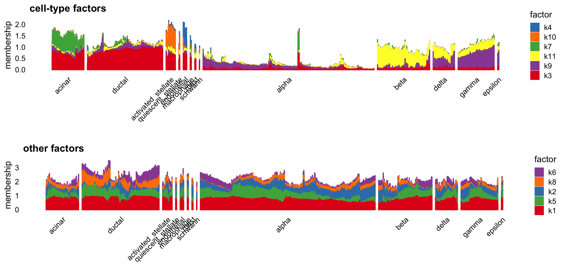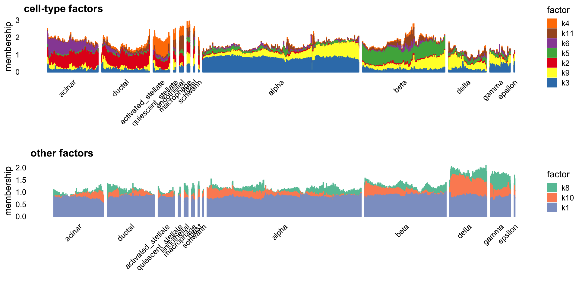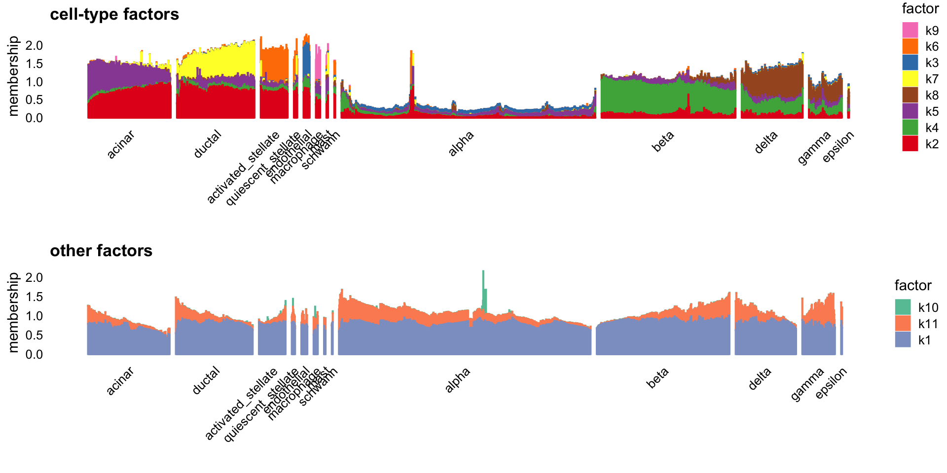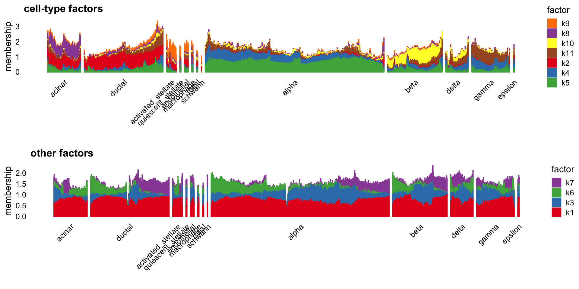 This covariance decomposition captures much of the same structure as the semi-NMF above — I tried to show this by using the same colors for the factors — but also missed some interesting structure, e.g., a separate factor for endothelial cells, and does not distinguish well alpha cells from delta and gamma cells.
