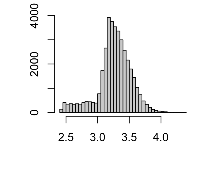 hist(log10(x),n = 64,xlab = "",ylab = "",main = "")