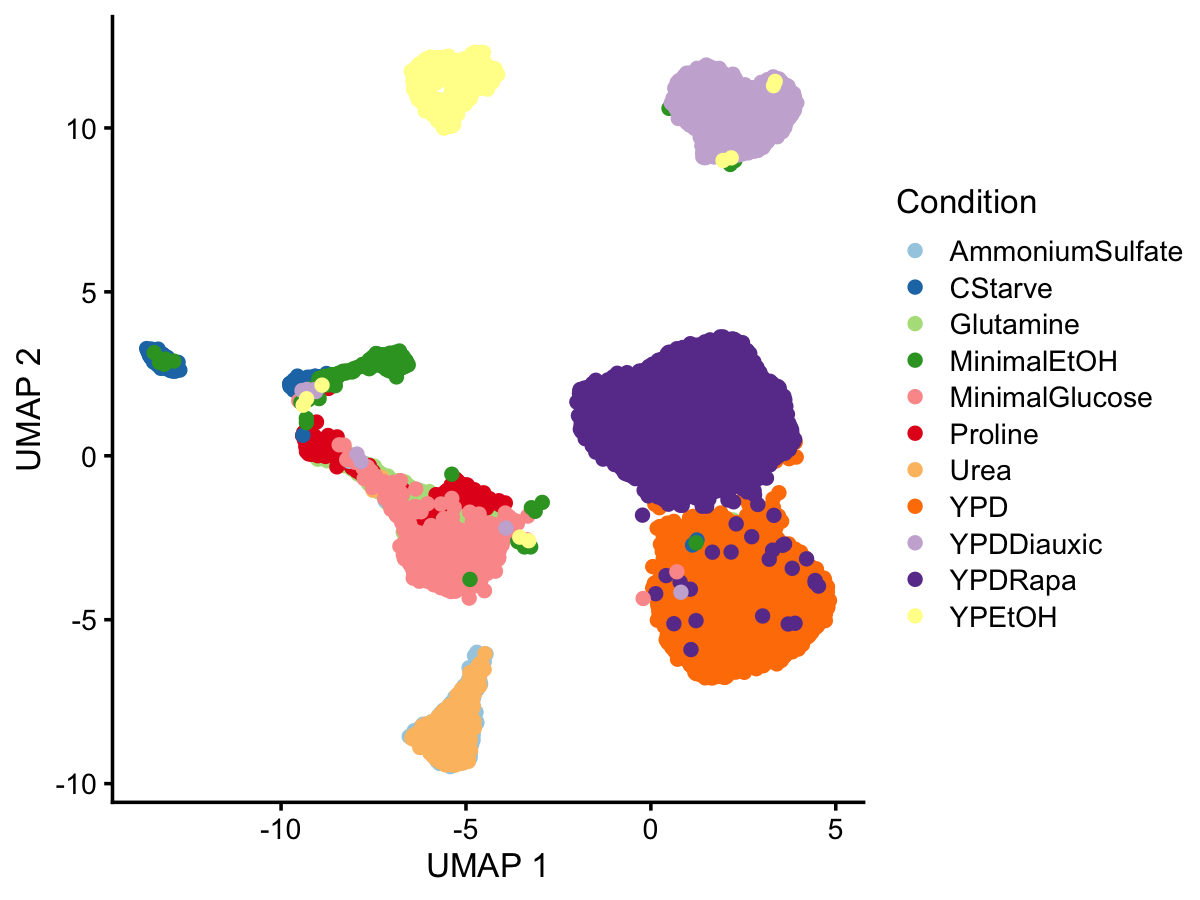 From this result, it is quite clear that the predominant structure corresponds to the different growth conditions. (This UMAP plot closely replicates Fig. 2B of the eLife paper.)