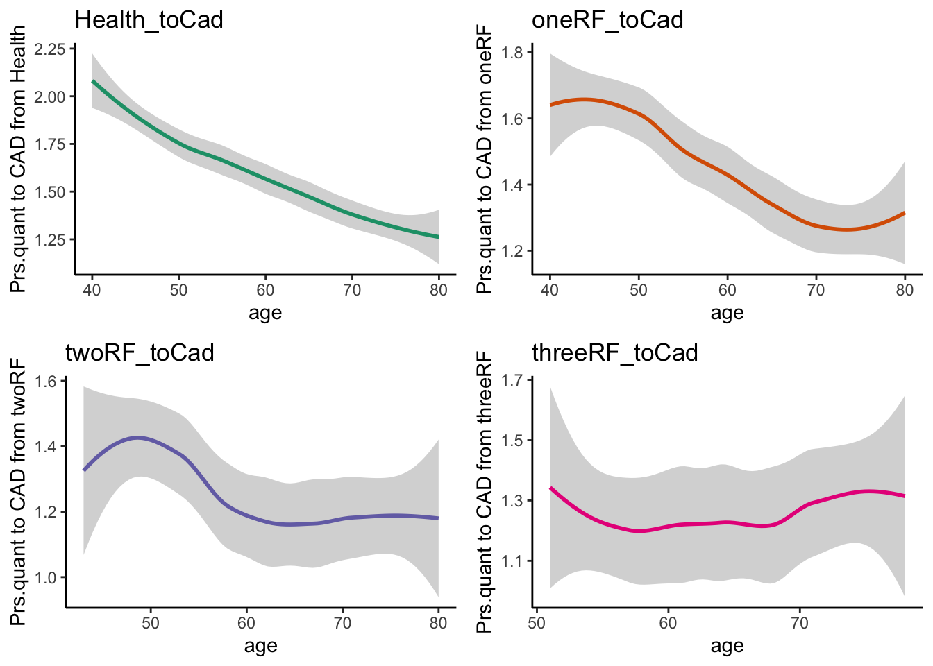 Here we plot transition OR by PRS quantile from each state to CAD for example.