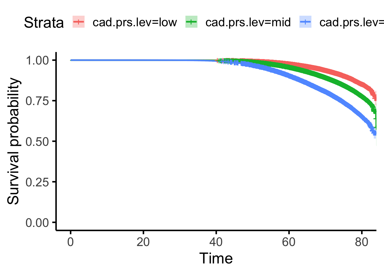 fit <- survfit(Surv(Cad_0_censor_age, ifelse(df_final$Cad_0_Any==2,1,0)) ~cad.prs.lev, data=df_final, id=identifier)