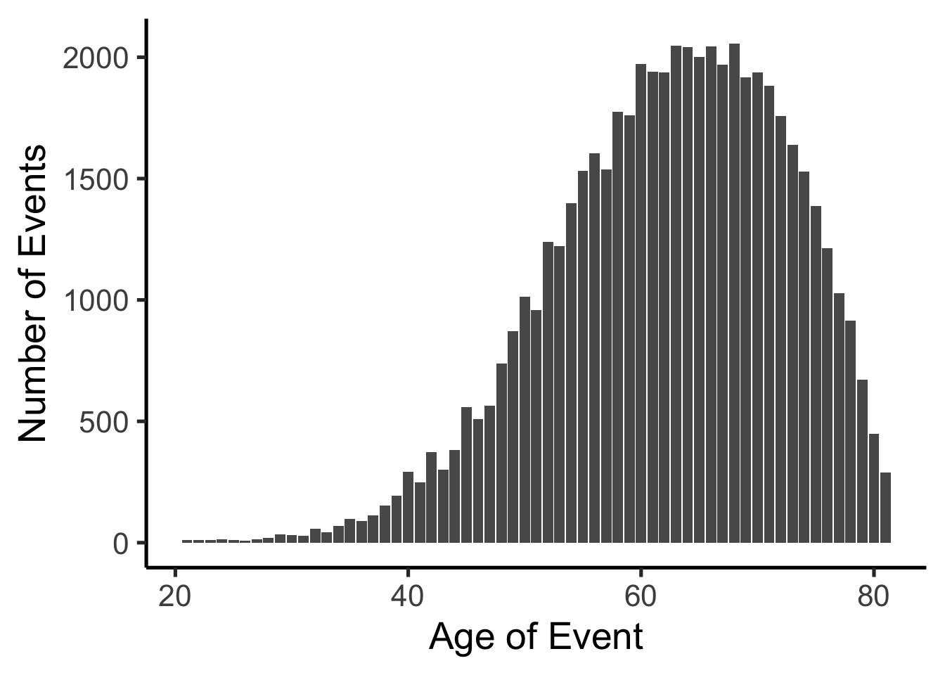 ggplot(c[20:80,], aes(x=age, y=events))+geom_bar(position='dodge', stat='identity')+xlab("Age of Event")+ylab("Number of Events")+theme_classic(base_size =20)