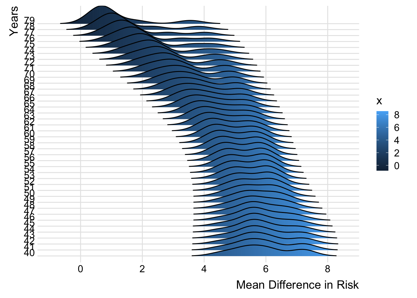We fit the model and plot the ten year versus lifetime absolute risk reduction for inddividuals starting from health.